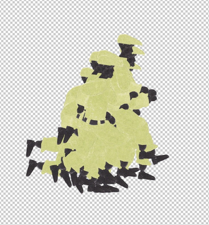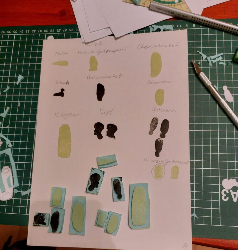 Um die Papiergrafik zu erreichen, ist alles komplett über eine Art Marionettensystem von Hand animiert. Dies habe ich erreicht indem ich zuerst alle Einzelteile der Figuren aufgezeichnet und dann als Schablonen für Stempel verwendet habe. Mit diesen Stempeln habe ich dann verschiedene Arten Papier bedruckt und diese eingescannt.